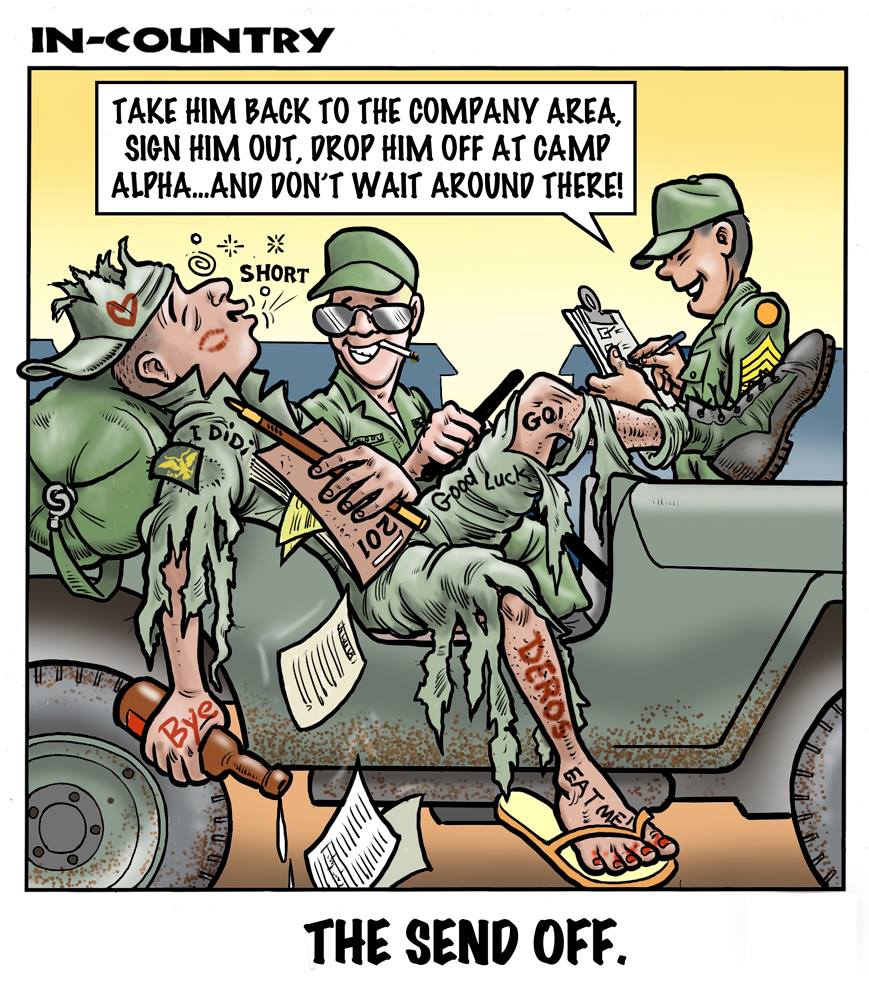 Phil enlisted in the Army in 1965 where he served for years in Vietnam. He became a graphic designer and has worked for the state of Oregon for 26 years. He retired in 2003 and started the Cartoon "In-Country". The cartoons reflect his experiences during his tour of duty in South Vietnam.